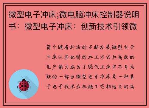 微型电子冲床;微电脑冲床控制器说明书:微型电子冲床:创新技术引领微型加工新纪元